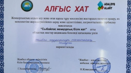 Қоғамның дерті болып табылатын сыбайлас жемқорлық туралы аймақтық іс-шарада Жамбыл индустриалды-технологиялық колледжінің білім алушылары өздерінің өткір ойларын ортаға салып, азаматтық көзқарастарын білдірді. Осынау "Сыбайлас жемқорлық бізге жат" тақырыбындағы облыстық жастар акциясына колледж студенттері белсенді қатысып, алғыс хатпен марапатталды!